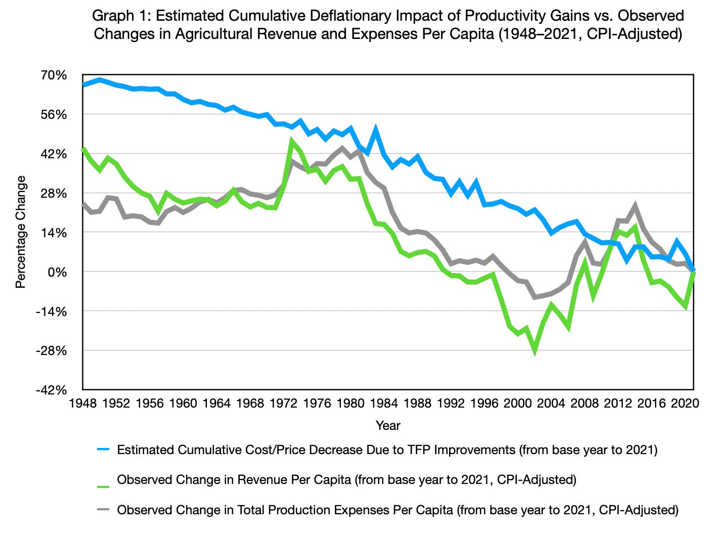 Estimated Cumulative Deflationary Impact of Agricultural Productivity Gains vs. Observed Changes in Per Capita Revenue and Expenses (1948–2021, CPI-Adjusted)