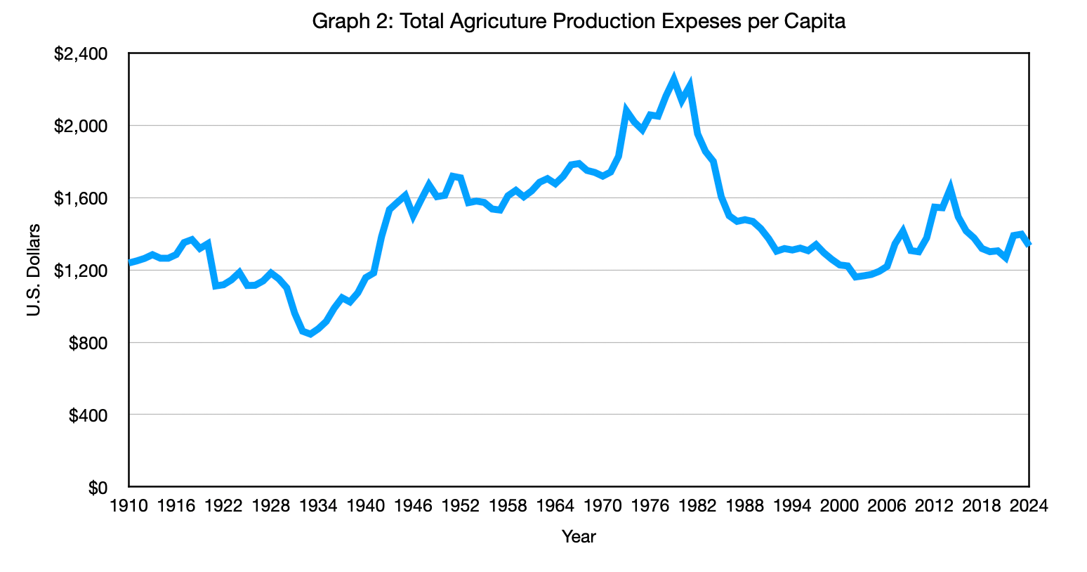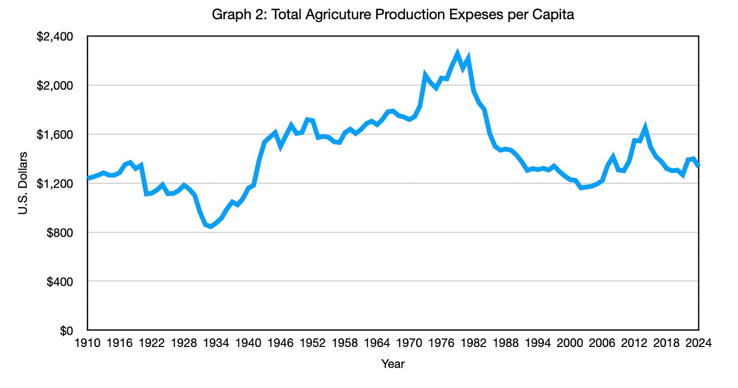 Graph 2: Total Agricultural Production Expenses Per Capita, Adjusted for CPI (1910–2024)