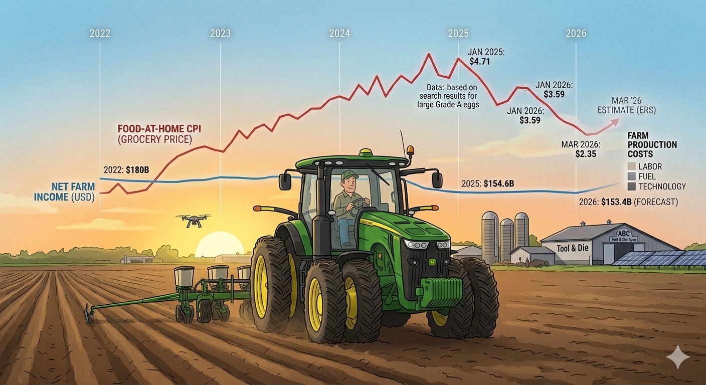 Unless otherwise noted, all dollar figures in this section are expressed in CPI‑adjusted 2024 dollars. The charts and tables draw on standard public data sets, USDA (NASS and ERS), BLS, Census, FRED, and widely used population estimates, so nothing here depends on exotic or private sources. To keep the main story readable, I limit in‑text citations and technical details; each figure has a short caption explaining how it was calculated and which datasets it uses. A Methods and Sources section at the end lists all underlying series and transformations, so anyone who wants to audit or recreate the charts can do so.