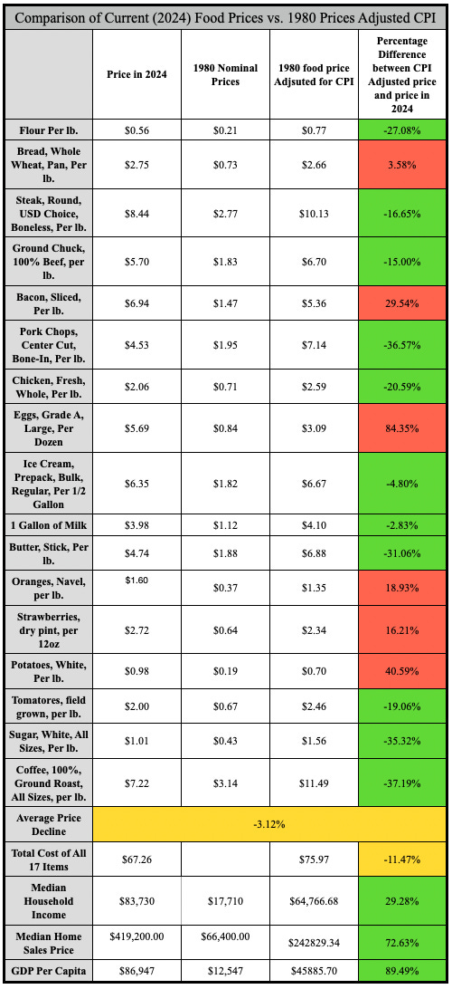 Comparison of Current (2024) Food Prices vs. 1980 Prices Adjusted CPI
