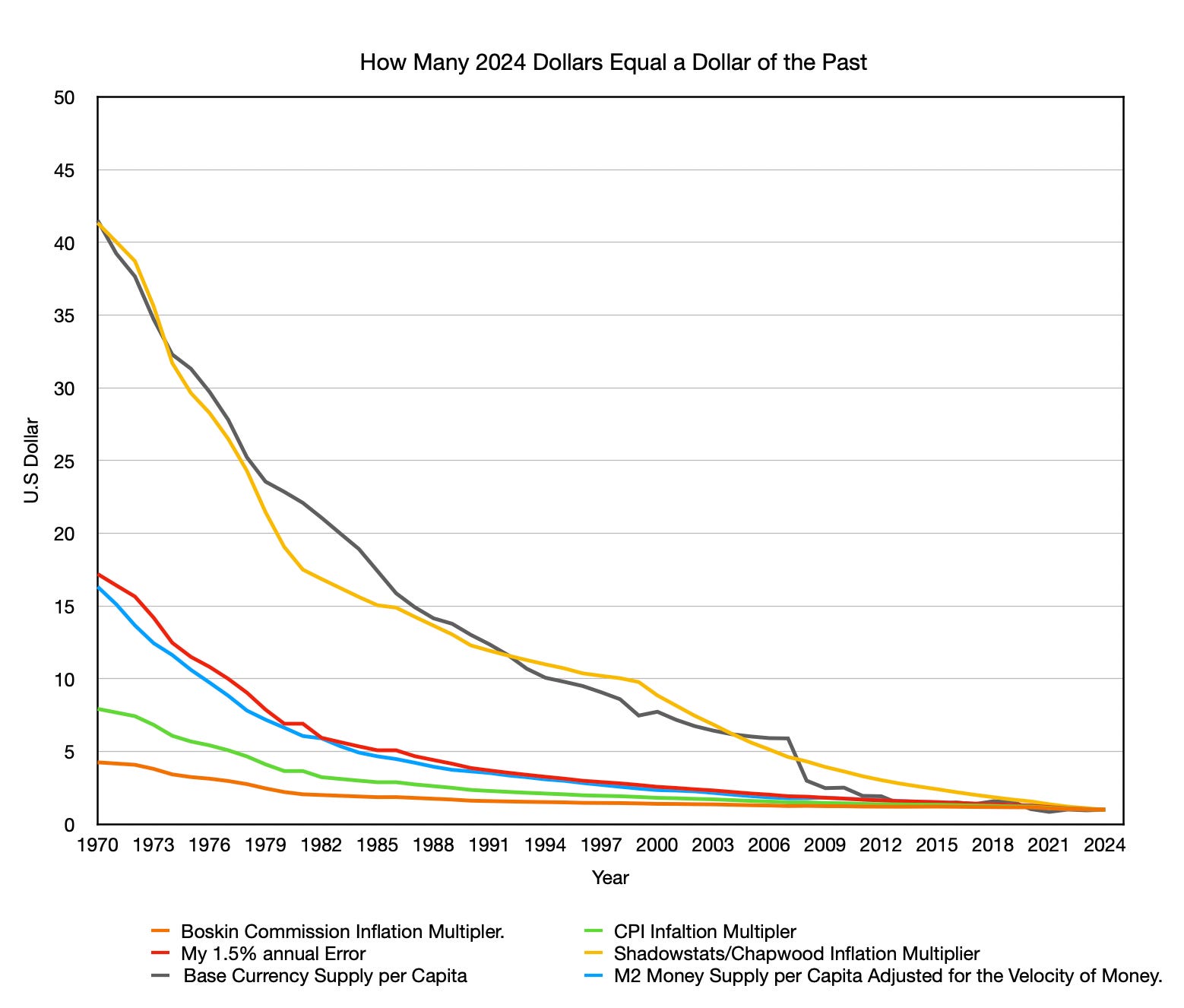 The graph above shows how many dollars today it takes to equal one dollar from the past under different measures of inflation. For example, the M2‑baseline adjusted for velocity of money indicates that $1 in 1980 is roughly equivalent to about $7 in 2024, depending on the exact dates and revisions. Each curve is an inflation “multiplier”: it takes a past dollar and compounds it forward to 2024 to show how much nominal cash you would need today to have the same purchasing power if that index were the true measure of inflation. The graph plots these CPI‑based multipliers alongside two monetary benchmarks: one based on the monetary base per person and one based on M2 per person adjusted by the velocity of money, which reflects only the portion of broad money that actually turns over into measured spending each year.