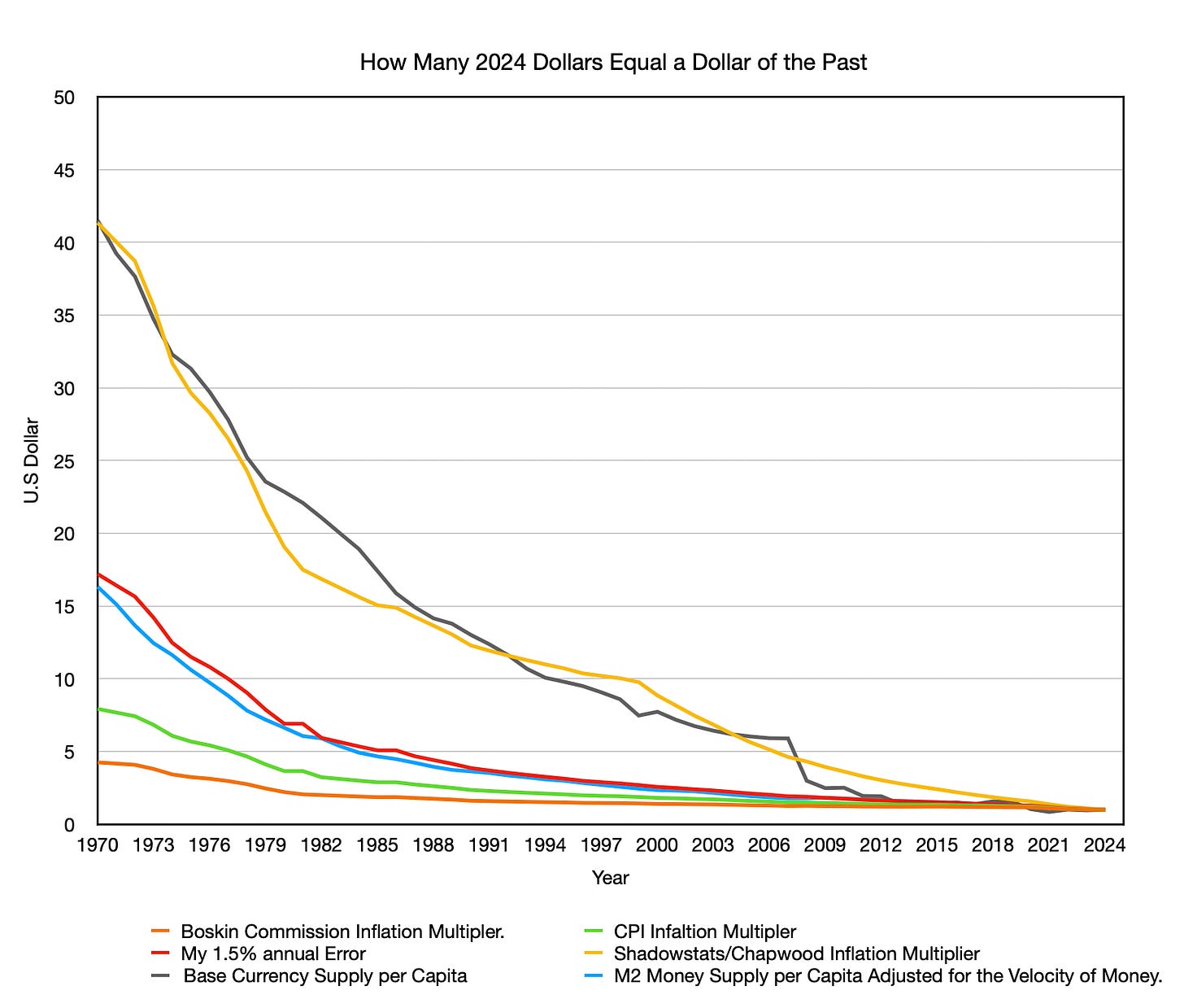 My 1.5‑percent annual understatement thesis (red) tracks the velocity‑adjusted M2‑per‑capita line most closely. This inflation interpretation is the most consistent with the classical view that broad money growth is the main driver of long‑run price levels of the inflation measures tested. It does mildly overshoot this benchmark, but the gap falls within the range of calculation error for GDP, M2, and an inflation adjustment based on an average drift. In practical terms, the money‑supply path is consistent with a CPI understatement of about 1.4–1.5% per year. I use 1.5% as a simple, rounded estimate rather than a claim of exact precision.